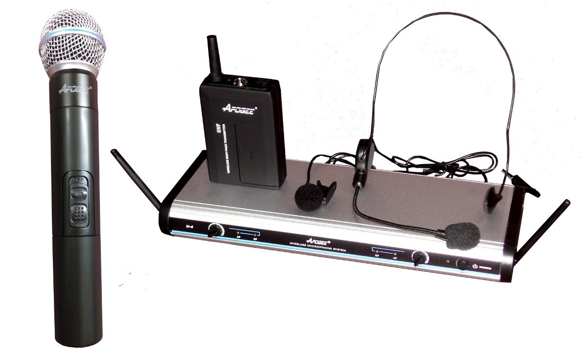 Micrófono de mano, head set, lavallier y cable para instrumento. Con receptor y estuche. Rango de frecuencia de 730 a 840 Mhz. Respuesta en frecuencia de 50 Hz. a 18 Khz. True diversity – Alcance de 60 metros.