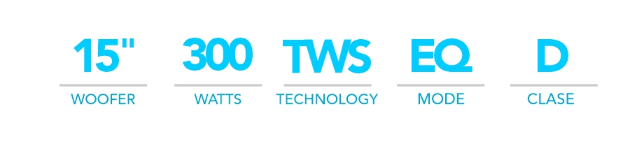 TIPO Caja acústica activa, 2 vías // WOOFER 15”, bobina de 1.5” // DRIVER RESPUESTA DE FRECUENCIA 65Hz – 20KHz // IMPEDANCIA 4 OHM // SENSIBILIDAD 94dB AMPLIFICADOR Fuente Switching, Class-D // ENTRADA DE MIC Jack 1/4” (6.5mm) ENTRADA DE LINE 2 x RCA // SALIDA DE LINE 2 x RCA // EQ Control de Graves y agudos ECO Si // POTENCIA 150W RMS, 300W Programa