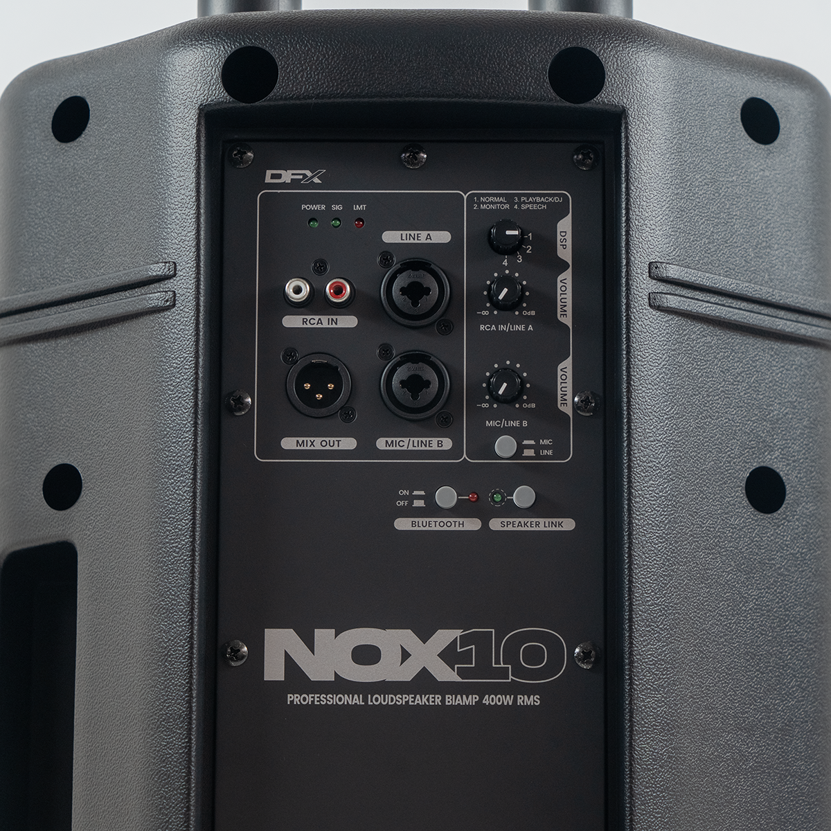 El DFX NOX 10 es una caja activa compacta de alto rendimiento, ideal para refuerzo de sonido, monitores de escenario o instalaciones fijas. Su amplificador Clase D de 700 W y su procesador