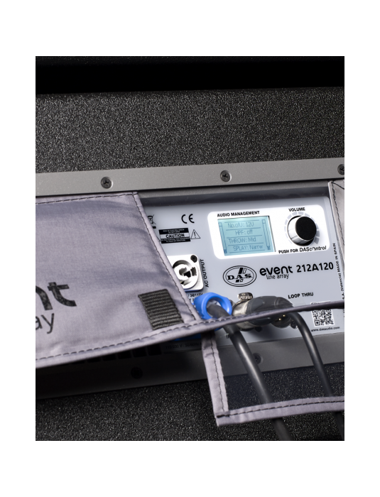 El line array EVENT-212A incorpora el interfaz DAScontrol™ que ofrece un rápido y eficaz ajuste de los sistemas en arrays, así como un fácil alineamiento con los subgraves EVENT-218A y EVENT-121A. Se pueden seleccionar diferentes preajustes para el número de unidades, compensación HF para tiro largo y corrección de la angulación del array, todo ello por medio de DAScontrol™ y una pantalla LCD situada en la parte trasera del recinto.