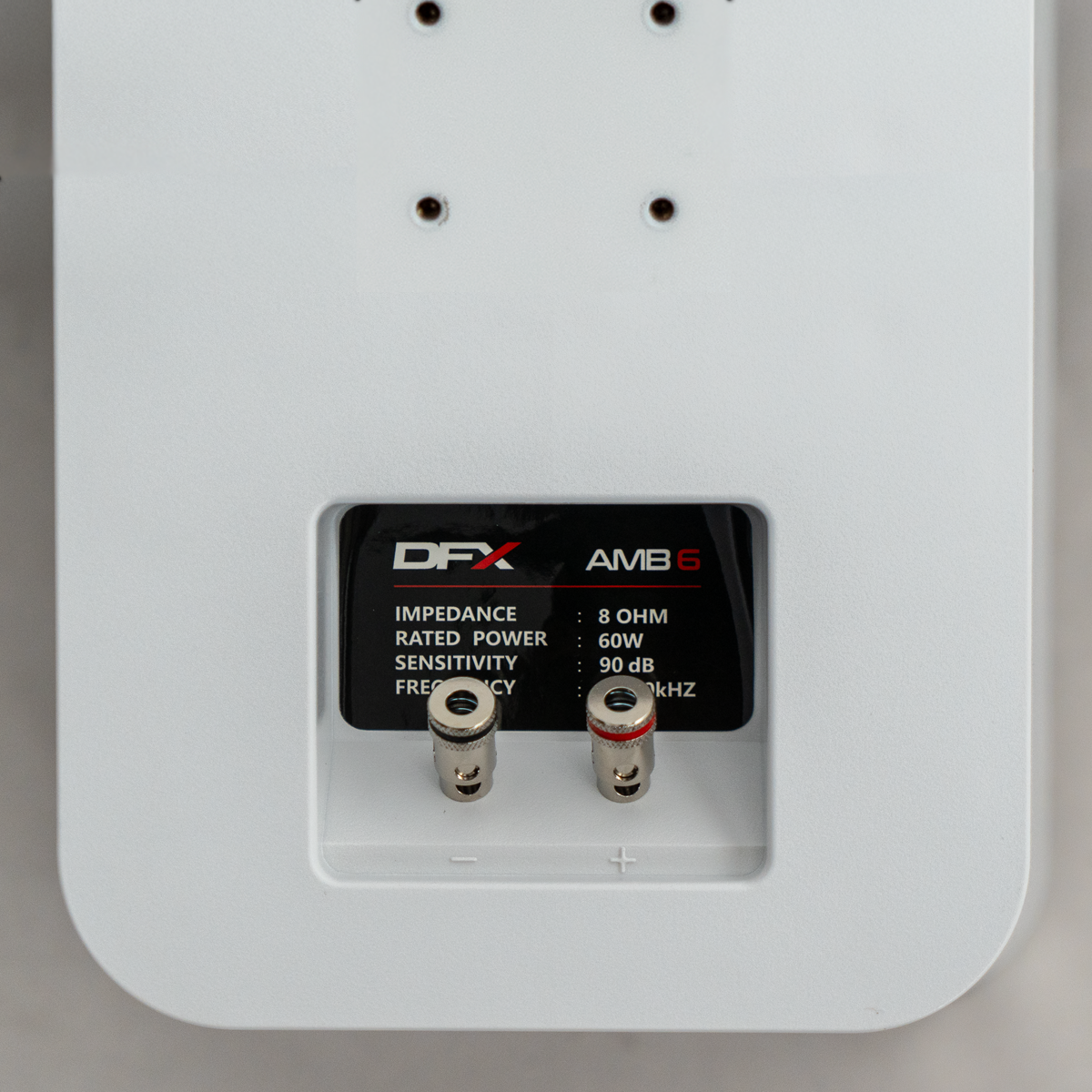 La Serie AMB es el puro estilo DFX, combinando alto rendimiento, diseño compacto y construcción robusta y resistente le dan la entrada a una línea de sistema de parlantes con una versatilidad sin precedentes y uno de los sistemas disponibles más simples para instalar en cualquier espacio. Perfecto para situaciones donde las curvas cerradas y los ángulos son muy comunes, AMB6 ofrece una amplia variedad de montajes disponibles que permiten ser posicionados dentro del recinto para un rendimiento óptimo. La Serie AMB es grande en características y calidad de sonido. El AMB es un parlante ambiental de dos vías, cuyo woofer es de 6 pulgadas entregando una potencia RMS de 60W.