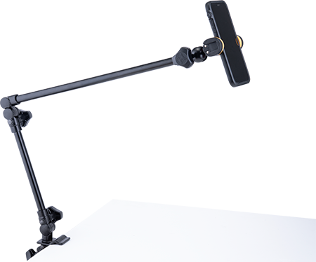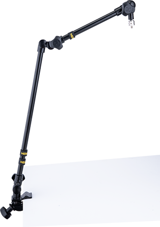 El soporte universal para brazo de cámara y micrófono para podcast. Opciones de montaje: tornillo de rosca para cámara de ¼»- 20, adaptador de rosca de micrófono integrado de 3/8″ a rosca de micrófono de 5/8″, abrazadera adaptable para escritorio/tubo. Rango de sujeción: 15 mm – 35 mm (0,6” – 1,3”)