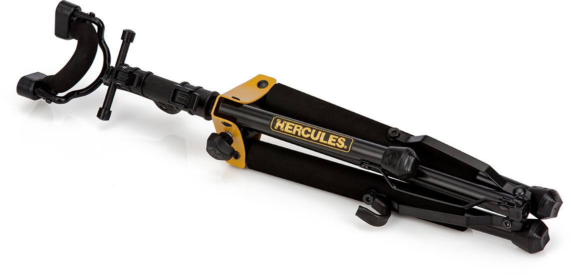 El soporte para violín/viola HERCULES DS571BB presenta el yugo Auto Grip System (AGS) que protege el instrumento y es lo suficientemente compacto para transportarlo fácilmente.