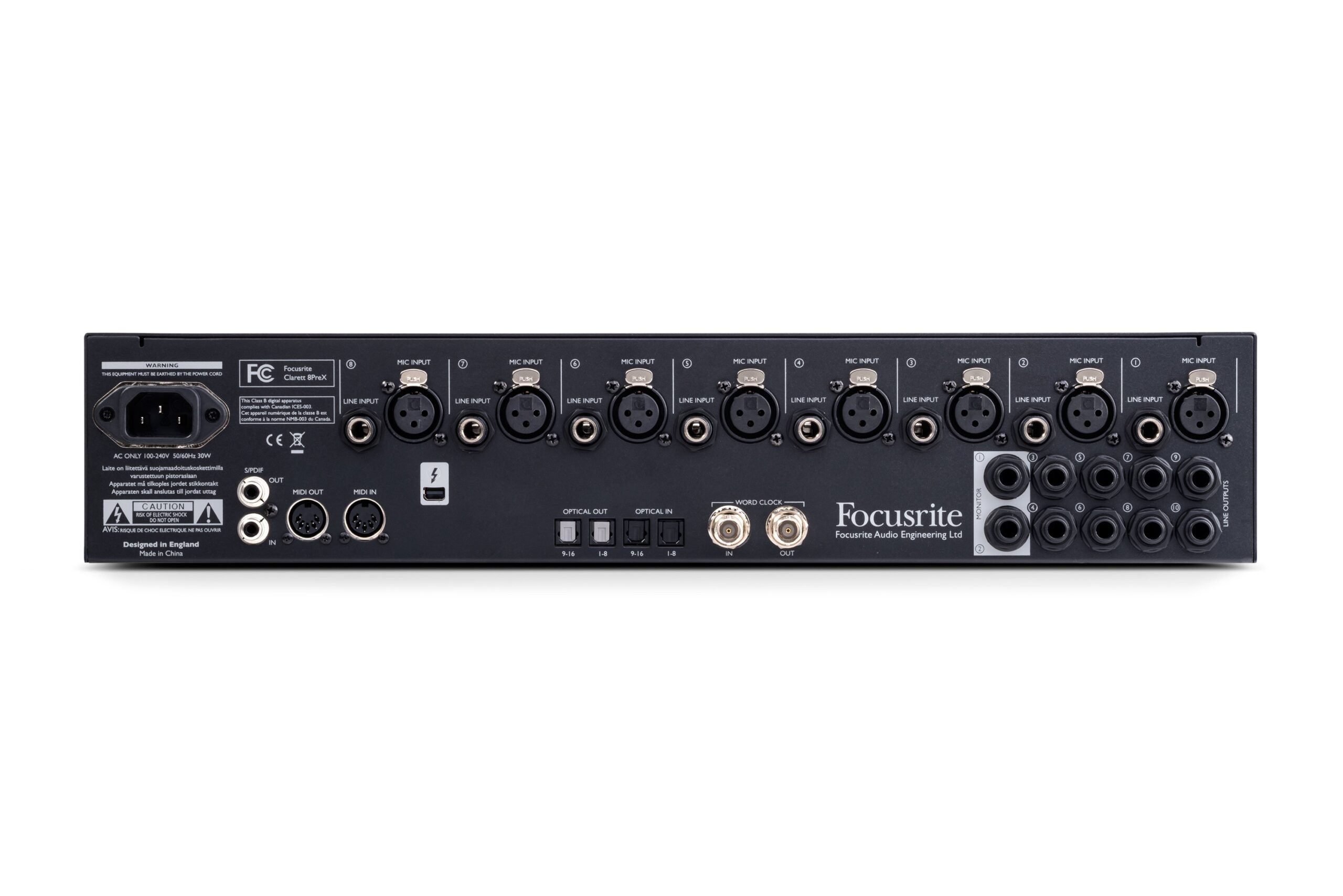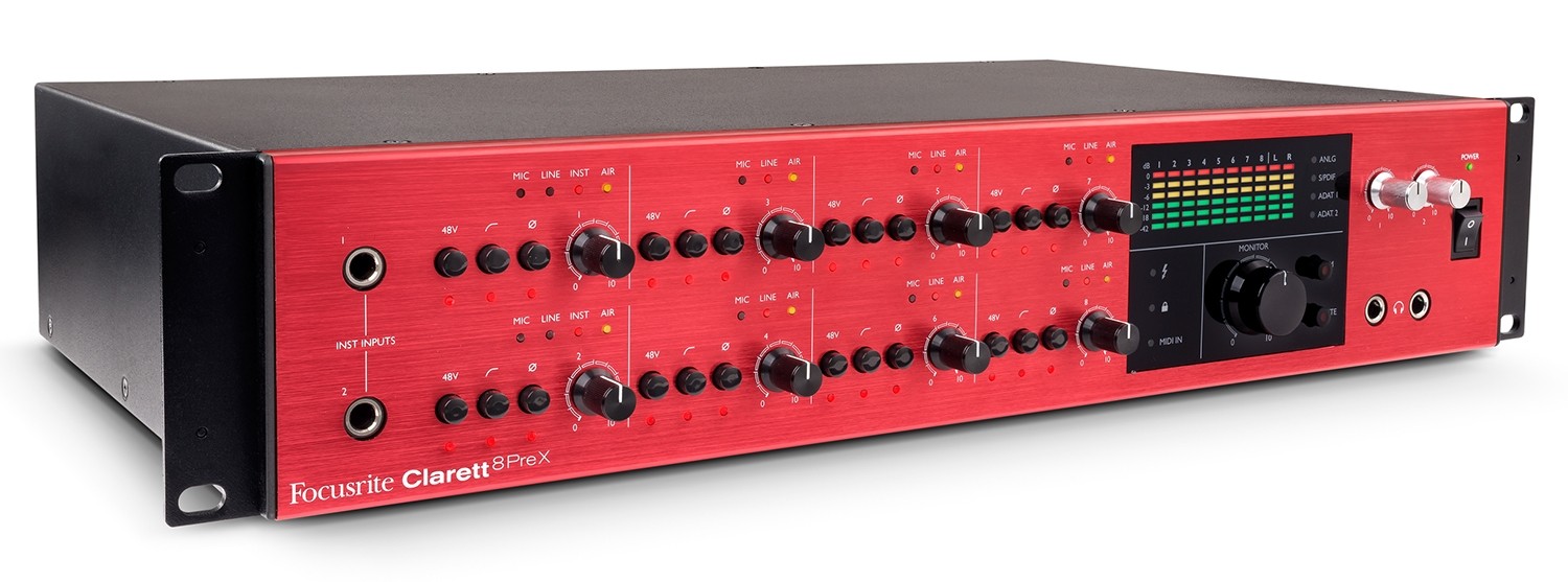 Focusrite Clarett 8 Pre X es una interface de audio thunderbolt. La nueva serie Clarett de Focusrite son interfaces que unen la última tecnología de conexión con la mayor calidad de conversores A/D-D/A, además de incluir previos de micrófono basados en la famosa línea ISA de Focusrite. En esta serie Focusrite Clarett existen varias versiones para cubrir todas las necesidades profesionales en cada uno de los casos. Focusrite Clarett ofrece 2, 4 u 8 previos, entrada y salida MIDI, SPDIF, wordclock de sincronía, entradas y salidas analógicas, entradas y salidas digitales ADAT, y mucho más a un precio muy competitivo teniendo en cuenta todas la características y su tipo de conexión, ya que, con esta conseguiremos latencias por debajo de 1 ms.